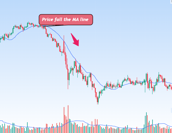 A sell signal is generated when the price of the financial instrument crosses below the moving average line. This can indicate a potential reversal or a downward trend in the price. Traders might interpret this as a signal to exit a long position or potentially enter a short (sell) position.