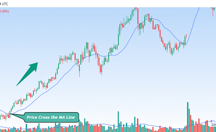 A buy signal is generated when the price of the financial instrument crosses above the moving average line. This can indicate a potential reversal or an upward trend in the price. Traders might interpret this as a signal to enter a long (buy) position.
